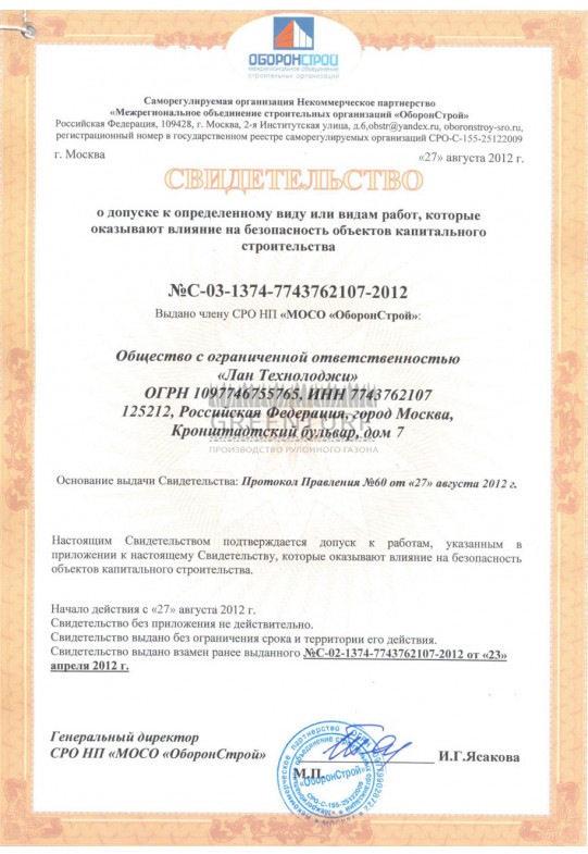 • Свидетельство о допуске к определенному виду или видам работ, которые оказывают влияние на безопасность объектов капитального строительства №С-03-1374-7743762107-2012