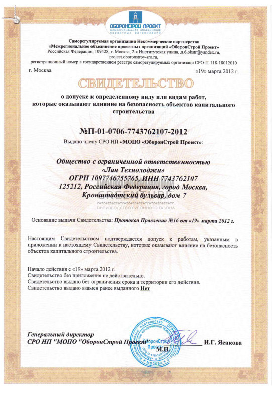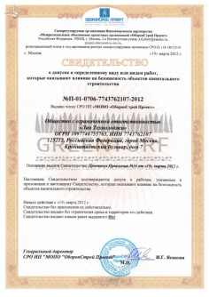• Свидетельство о допуске к определенному виду или видам работ, которые оказывают влияние на безопасность объектов капитального строительства №П-01-0706-7743762107-2012