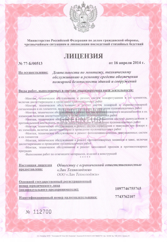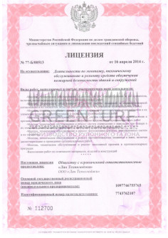 • Лицензия № 77-Б/00513 от 16.04.2014 г. на осуществление деятельности по монтажу, техническому обслуживанию, и ремонту средств обеспечения пожарной безопасности зданий и сооружений