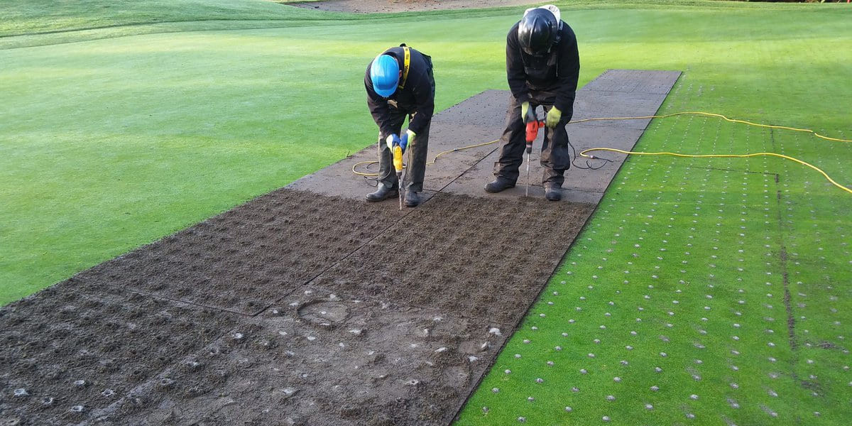 На фото сверление отверстий для глубокой аэрации и тордрессинга (диаметр: 18 мм, глубина: 25 см).